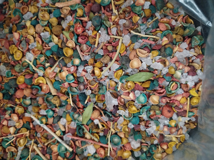 اسفند رنگی ترکیبی شامل اسفند پوست کنده و با پوست به همراه گلپر و زاج سفید به ترکیبی از رنگهای مختلف است