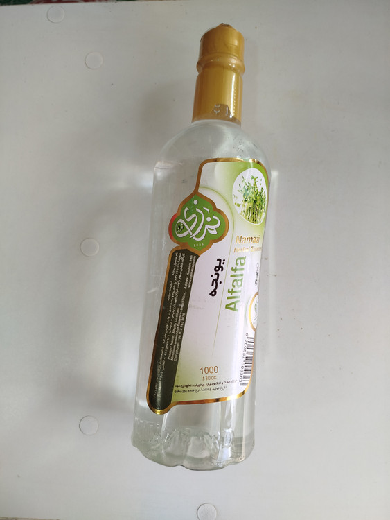 عرق یونجه نمازی با سیب سلامت، نشان استادندارد و تاریخ مصرف ثبت شده.